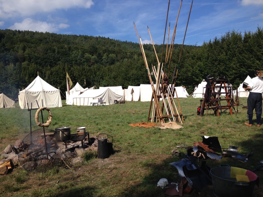 Ganz besonders bewundernswert war die Kondition der Gäste aus Wien, die sich den Pikenieren angeschlossen hatten. In glänzender Metallrüstung und doppelt übereinandergezogenen Wollhemden (man war schließlich in den hohen Norden gekommen), taten sie die Hauptarbeit bei den Pikenierübungen. Noch bewundernswerter war, dass sie sich nach den Gefechtsübungen bei fast 35° im Schatten, an das Lagerfeuer setzten. Diesen Platz konnten sie dann auch unangefochten verteidigen.